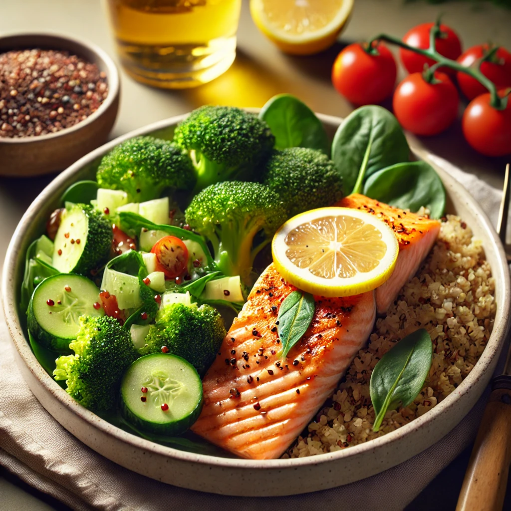 🐟 구운 연어 + 🥦 찐 브로콜리 + 🍚 퀴노아 샐러드