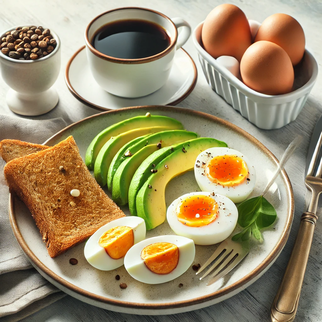 🥚 삶은 달걀 2개 + 🥑 아보카도 + 🍞 통곡물 토스트 + ☕ 블랙커피