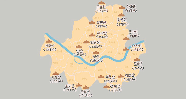 서울 중구와 용산구에 걸쳐 있으며, 서울타워와 함께 서울의 상징적인 산입니다. 난이도는 하이며, 정상까지 약 1시간 소요됩니다.