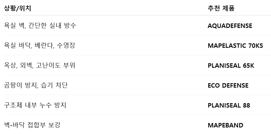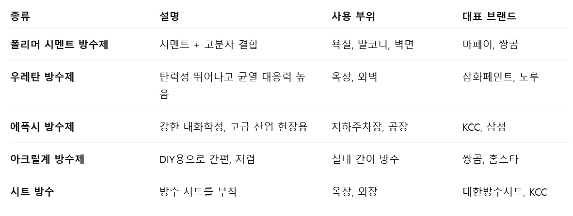 주요 방수제품 종류와 특성