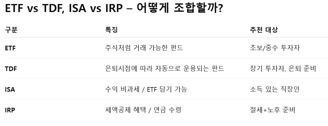 요즘처럼 금리 변동과 물가 상승이 지속되는 시대엔, 단순 저축만으로는 자산을 지키기 어렵습니다. ETF로 분산투자를 시작하고, ISA와 IRP로 세금 절약까지 챙기고, TDF로 노후 준비까지 자동화하세요.